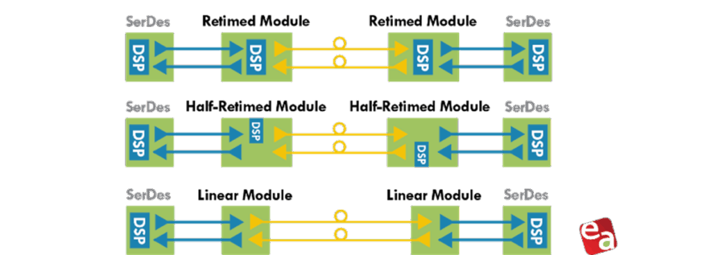 - Retimed Digital Signal Processor based (DSP) pluggables: These modules include DSPs that fully retime transmit and receive paths (two DSPs per module), maximizing tolerance to host and channel impairments and keeping jitter under control. They’re the conservative choice when reach, margin, or heterogeneous hosts are in play.